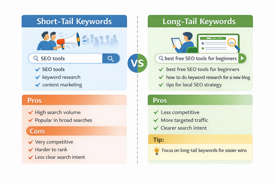 Tip: For beginners, long-tail keywords are usually easier wins and help your content rank faster.
